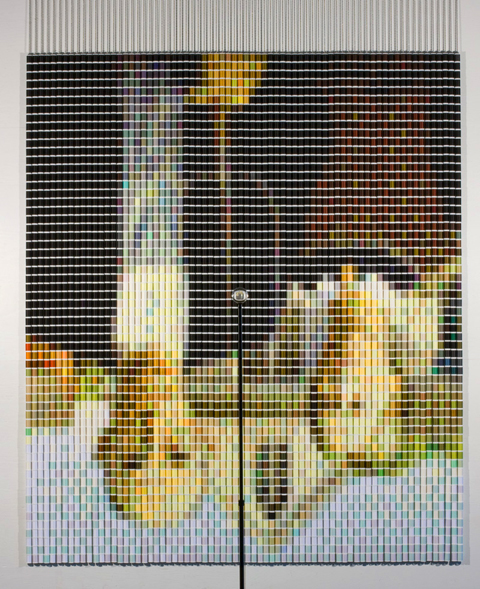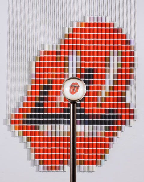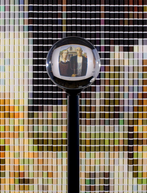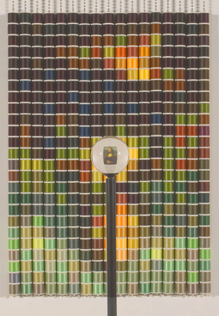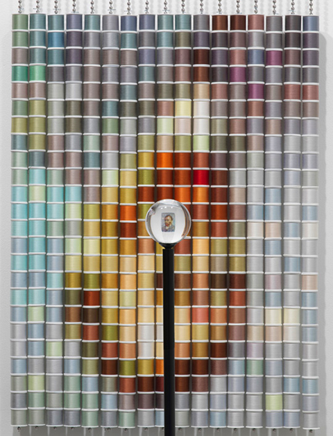 ” I am interested in the link between art, science, and technology, how the eyes and brain prioritize, and reality as a subjective experience vs. an absolute truth. As a visual artist, I cannot think of a topic more stimulating and yet so basic, than the act of seeing–how the human brain makes sense of the visual world. My current body of work consists of sculptures assembled from thousands of ordinary objects -spools of thread, marker-pen caps, map tacks, or chenille stems, combined with optical devices such as clear acrylic viewing spheres, convex mirrors, or reversed binoculars. I place equal emphasis on the whole recognizable image and how the individual parts function as abstract elements, selecting materials based on aesthetic and functional characteristics as well as for their capacity for a compelling and often contrasting relationship with the subject matter.” –