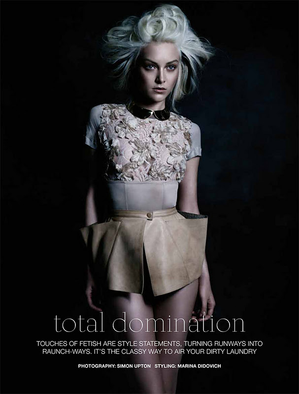 Total Domination – Marina Didovich pieces together a wardrobe of fetish inspired looks for a shoot in the spring issue of Fashion Quarterly NZ. Simon Upton captures model Ollie Henderson as she sports elegant looks from labels such as Louis Vuitton, Gucci and Miu Miu. Multi-colored locks by Sarah Laidlaw and sultry makeup by Justine Purdue perfect the naughty ensembles.
