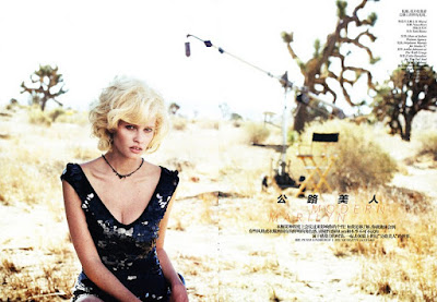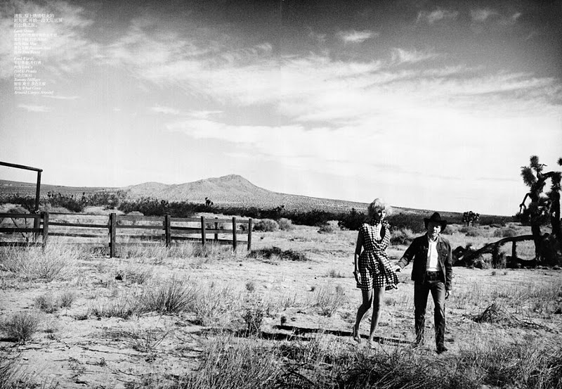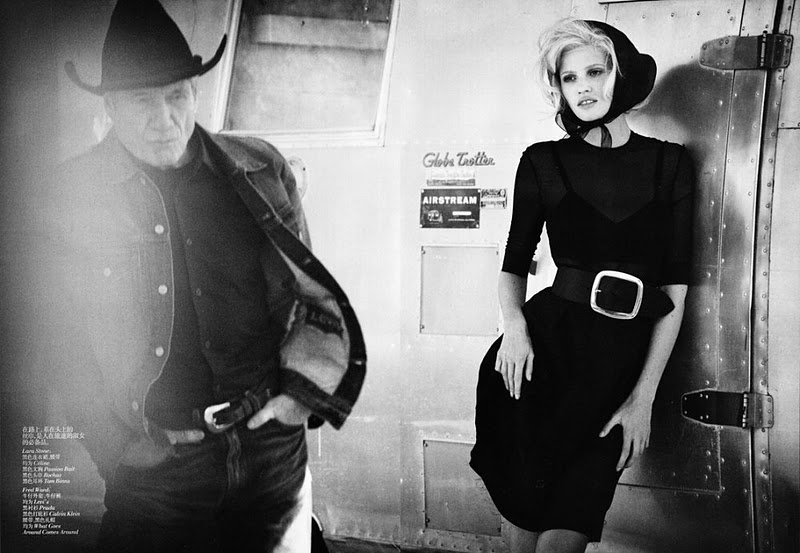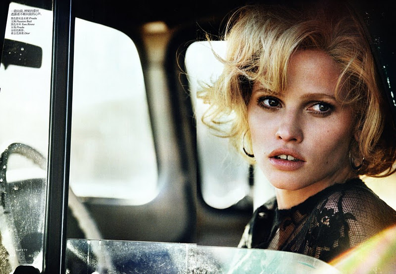 Modern Marilyn – Lara Stone channels iconic blonde bombshell, Marilyn Monroe, for the January issue of Vogue China. In front of Peter Lindbergh’s lens, Lara takes a cinematic trip with actor Fred Ward in form-fitting dresses and lingerie selected by fashion editor Nicoletta Santoro. Wearing designs from the likes of Marni, Miu Miu and Nina Ricci; the Dutch beauty wows with lush curls by Shon and smokey eyes by Stéphane Marais.